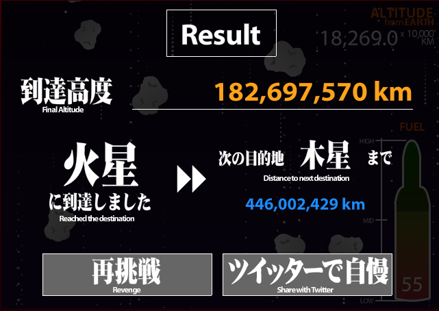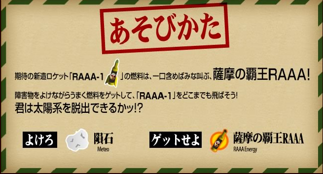 内容は「薩摩の覇王RAAA」を燃料としたロケット「RAAA-1」を操作して太陽系を脱出するというもの。