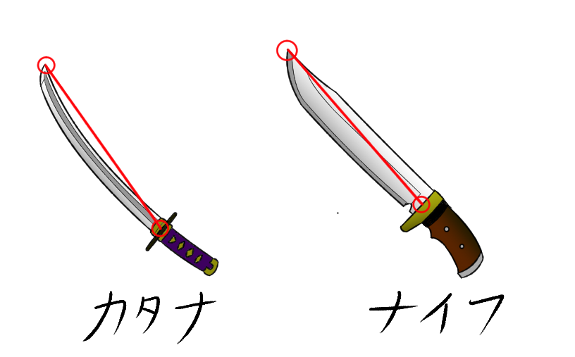 要は、切っ先と付け根を結んだ線が刀身から外れているのが刀。外れていないのがナイフといった感じになります。