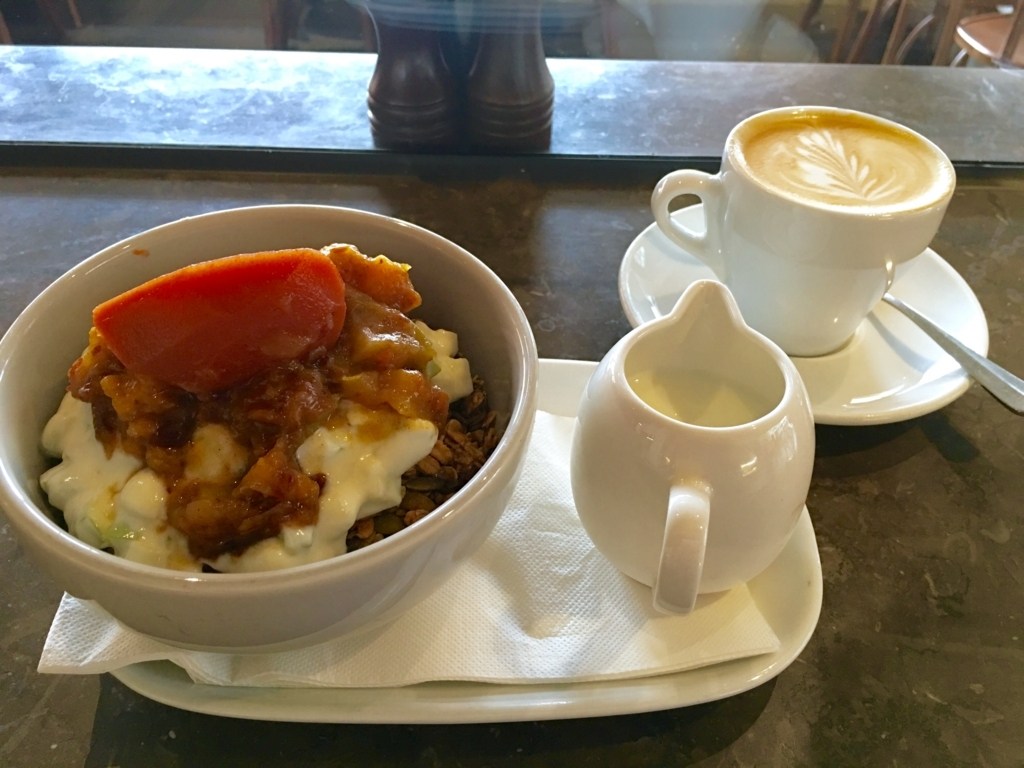 グラノーラとフラットホワイトというカフェ定番の朝食メニュー。