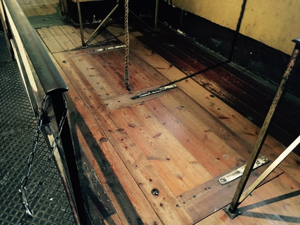 絞首台の床を見ると、底が外れる仕組みになってる。